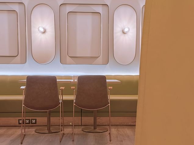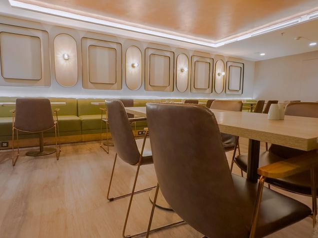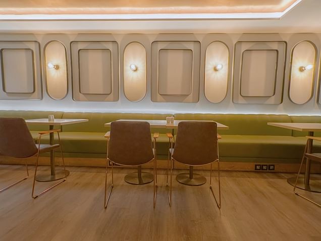 This stylish restaurant with a unique bank inspired design serves buffet breakfast.