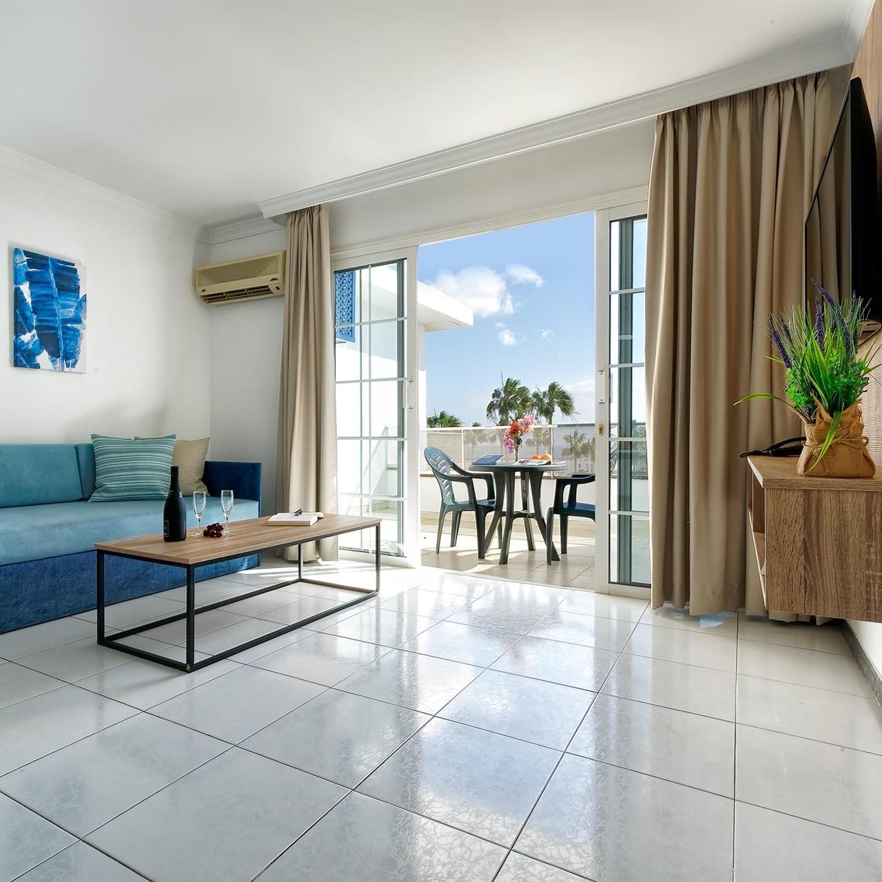 The Two Bedroom Apartments feature a private balcony or terrace, bathroom with shower and hair dryer, and come with fridge, tea and coffee making facilities, LCD TV (national and international satellite), air conditioning and safety deposit box. A well equipped kitchenette and living room with a sofa bed make each apartment the ideal accommodation for a memorable self-catering vacation.