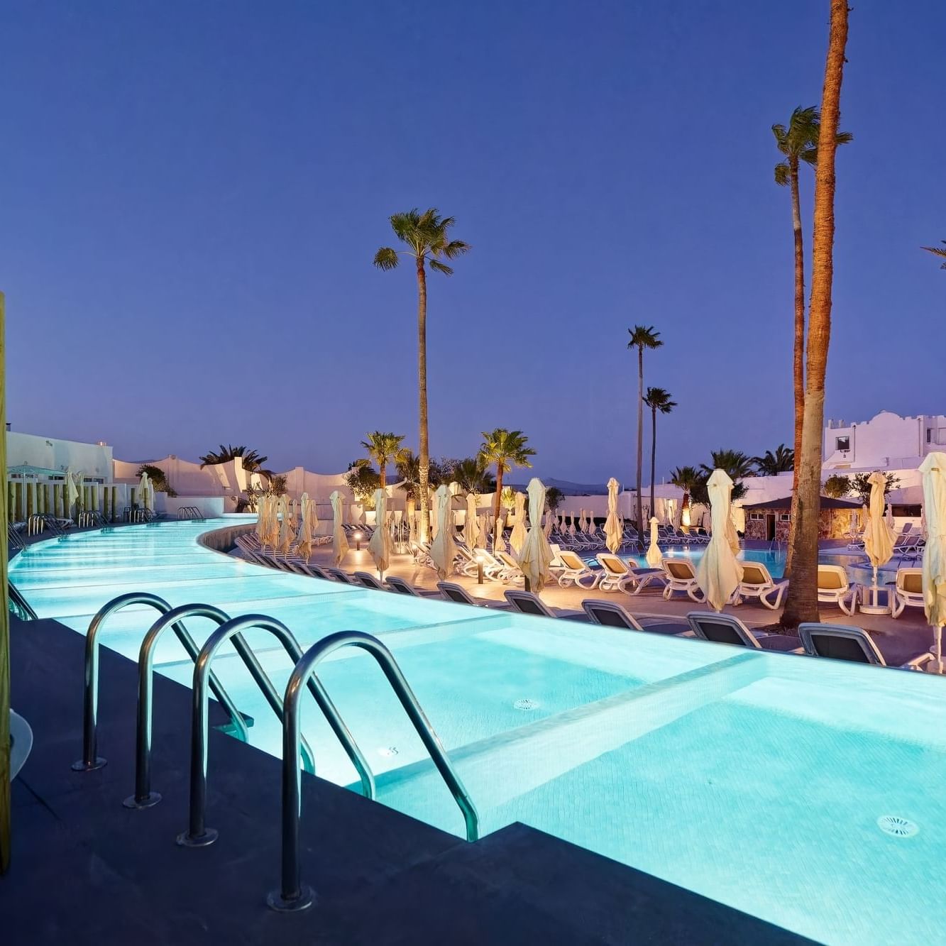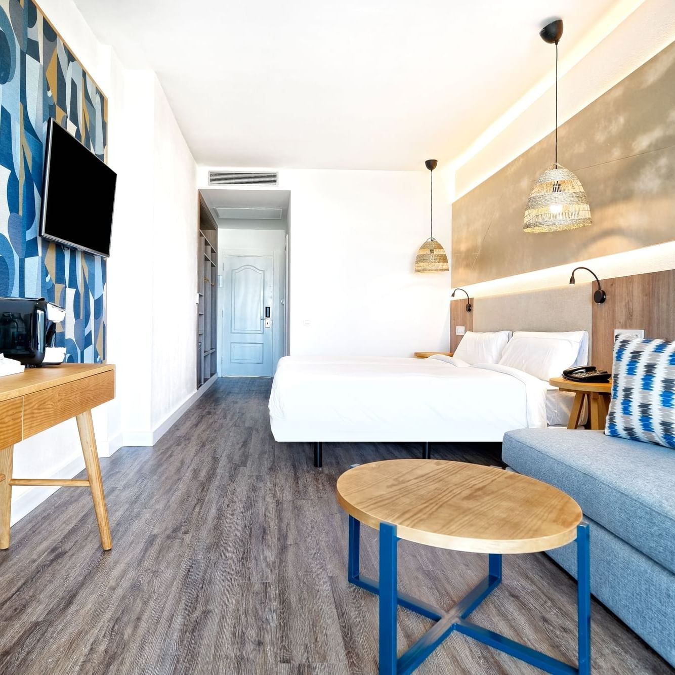 Opening up onto a terrace with a private swim-up pool, these well-appointed Deluxe Rooms are the ultimate accommodation option for a stylish Fuerteventura getaway. These 28 m² rooms feature comfortable sleeping area, living room with a sofa bed, and bathroom with shower and hairdryer. Among the room’s facilities are air-conditioning, safety deposit box, minibar (€) and TV.