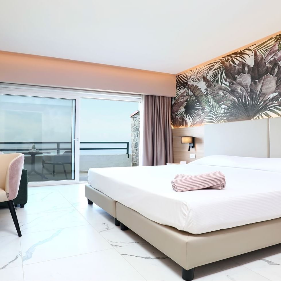 All'interno dei blocchi di edifici più piccoli e circondati dal giardino botanico dell'Hotel o in posizione strategica lungo la spiaggia bianca della Costa degli Dei, si trovano le Premium vista mare sapientemente ristrutturate e dall'arredamento moderno. Le camere Premium vista mare sono spaziose e confortevoli e dispongono di patio o balcone con vista sul mare. Ogni camera dispone di linea cortesia dedicata, minibar, TV LED 43", aria condizionata e asciugacapelli. L'occupazione massima delle camere Premium vista mare è di 2 adulti più 1 bambino.