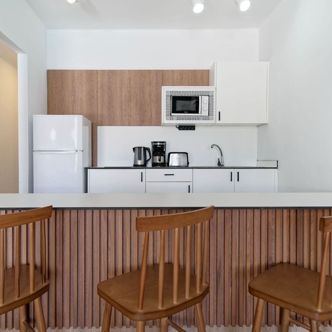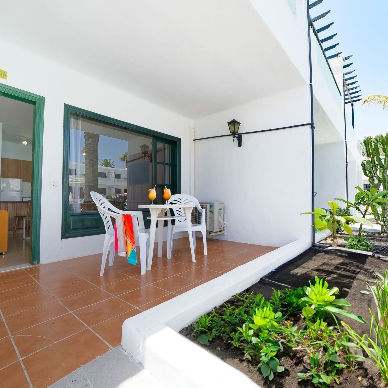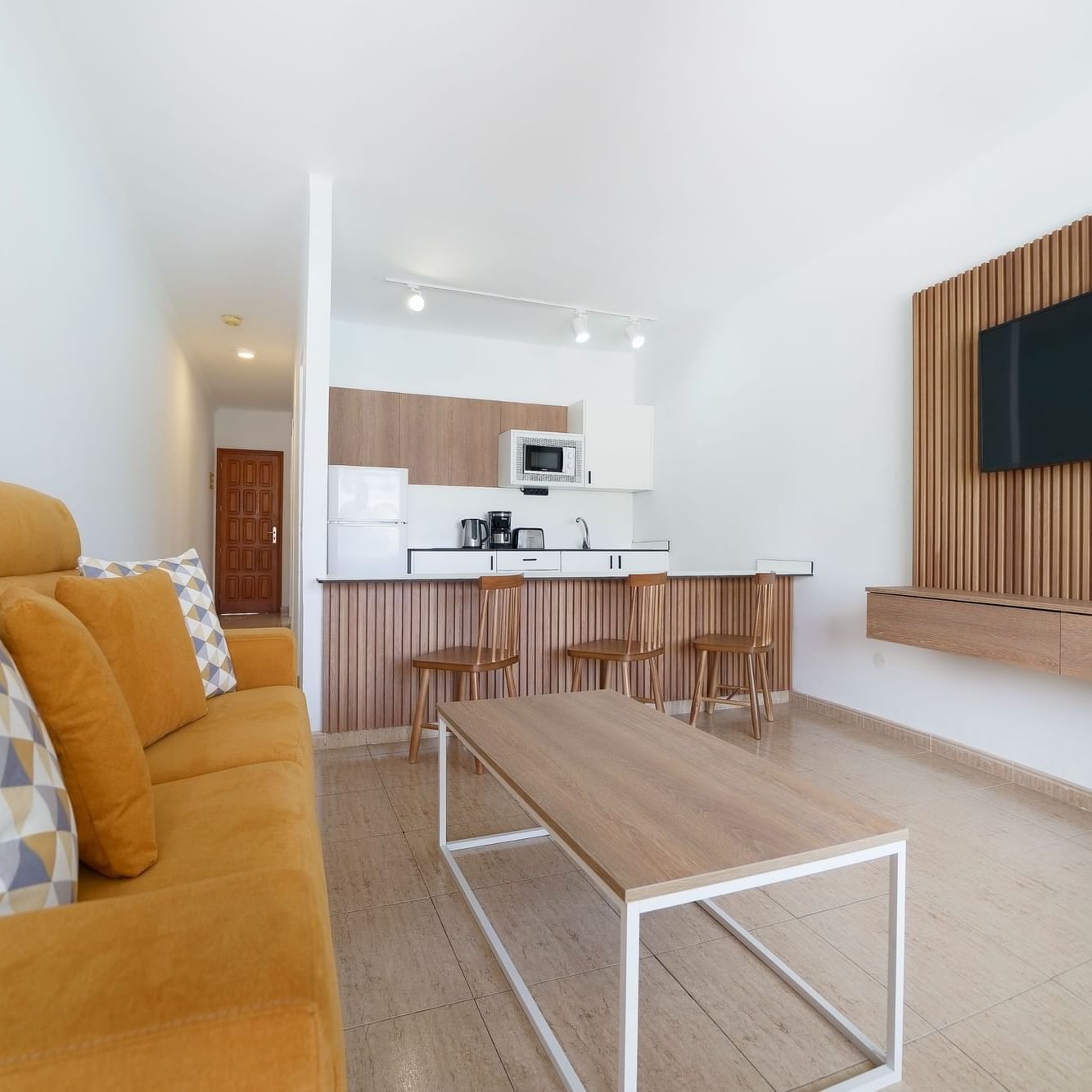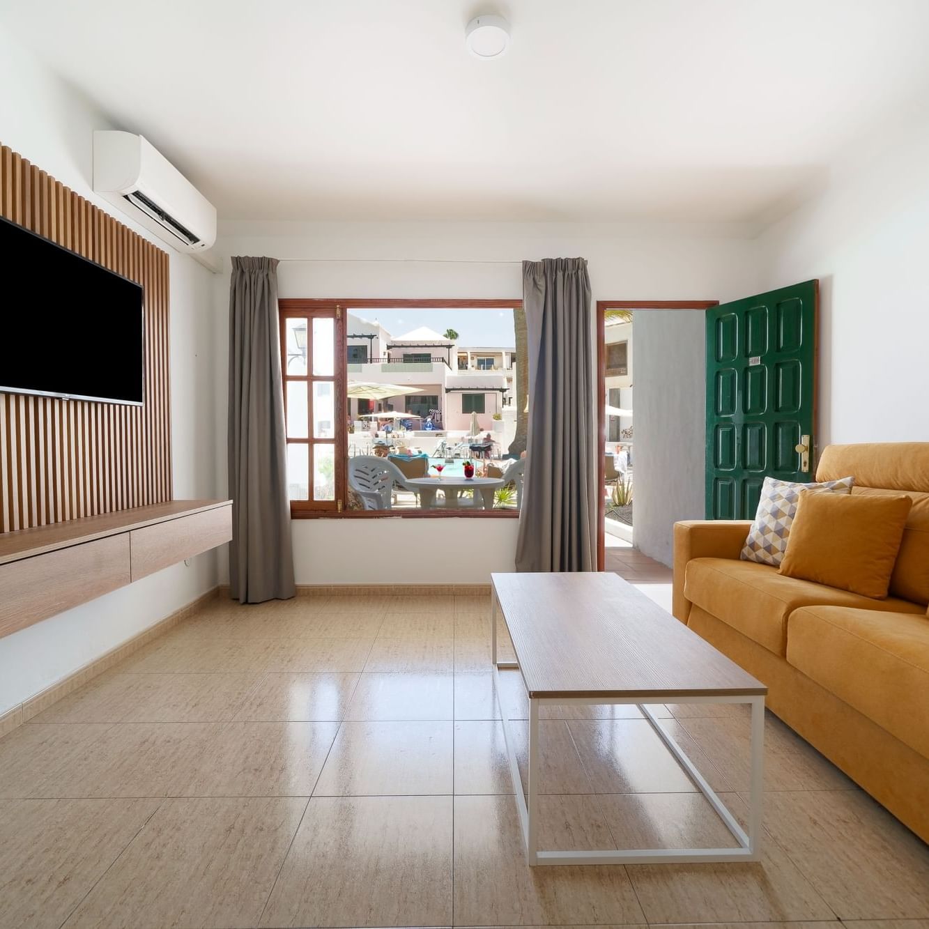 The One Bedroom Apartments consist of a bedroom, private balcony or terrace, bathroom with shower or bathtub and hair dryer. They come equipped with LCD TV (national and international satellite) and safety deposit box. A well equipped kitchenette with fridge, tea and coffee making facilities and toaster as well as a living room with a sofa bed, make each apartment the ideal accommodation for a memorable self-catering vacation.