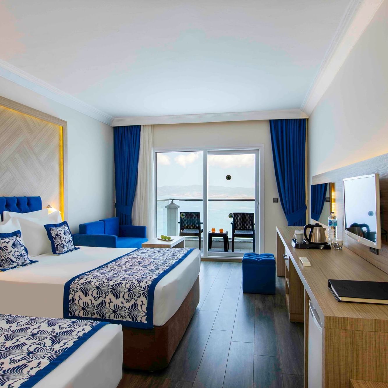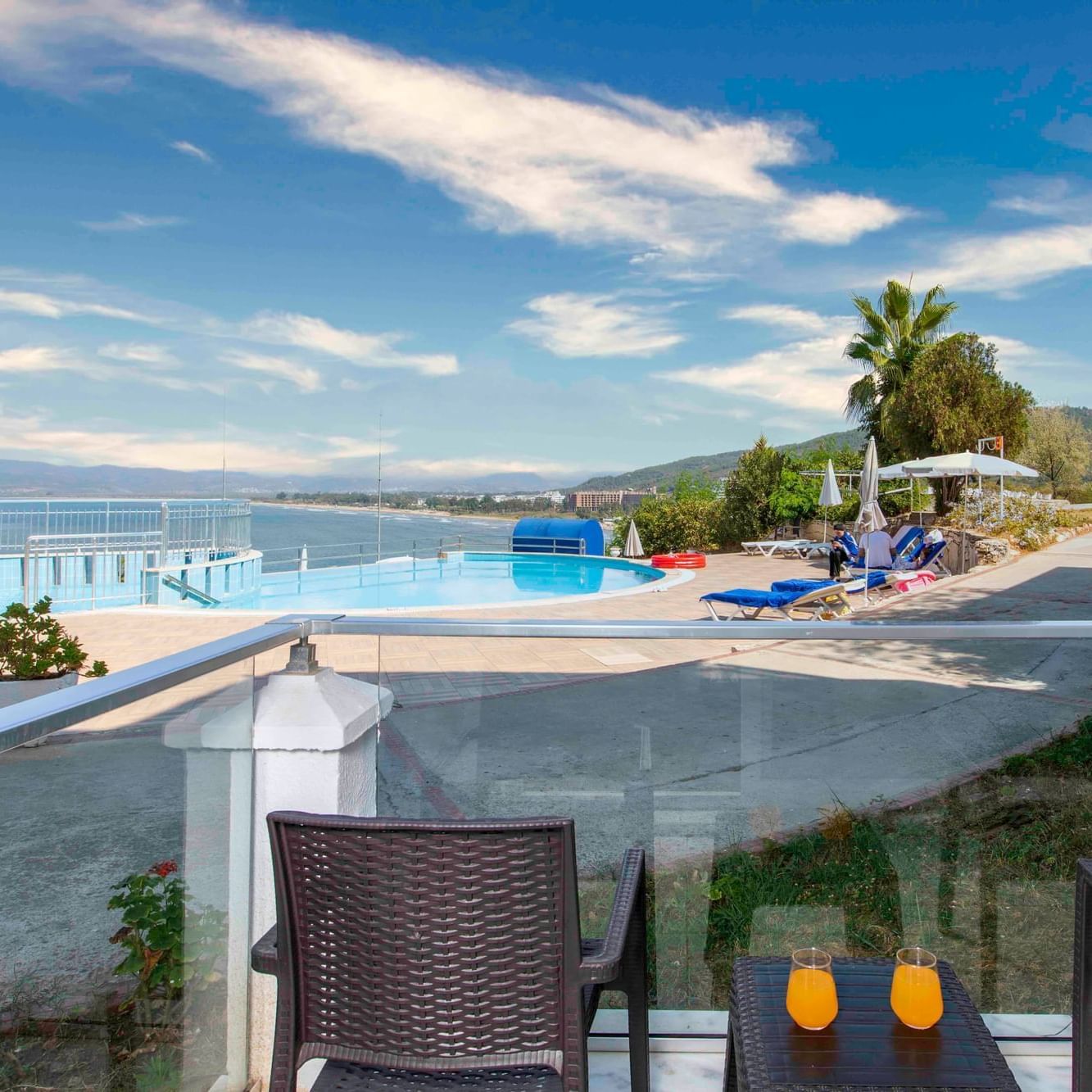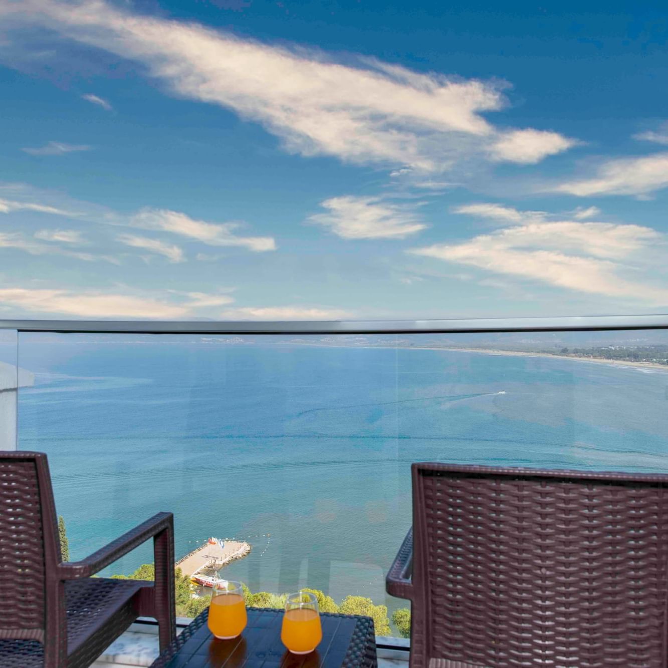 Номера с двухспальными или односпальными кроватями и видом на море расположены в главном здании отеля. В каждом номере повышенной категории есть телевизор с приемом спутниковых каналов, централизованная система кондиционирования воздуха с установленным временем функционирования, телефон с прямым доступом, бар-холодильник, фен, полностью укомплектованный санузел и балкон.