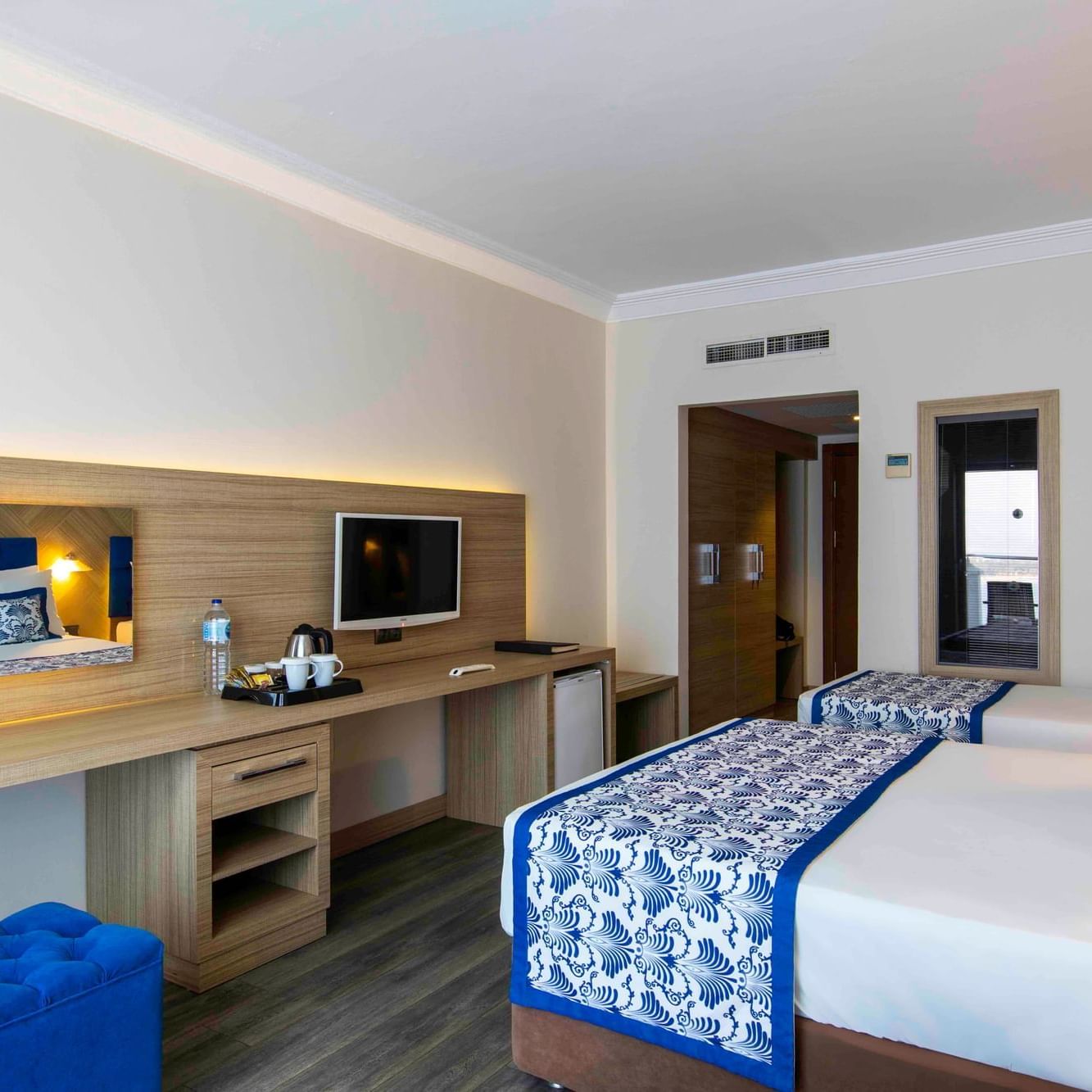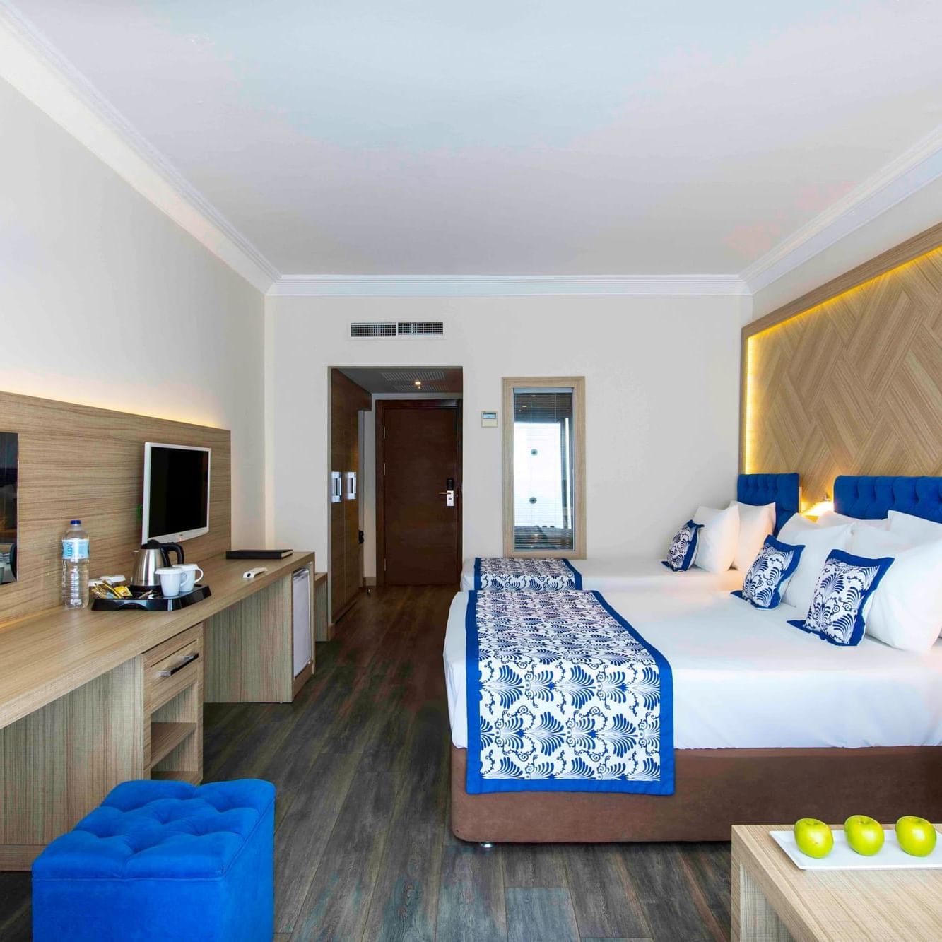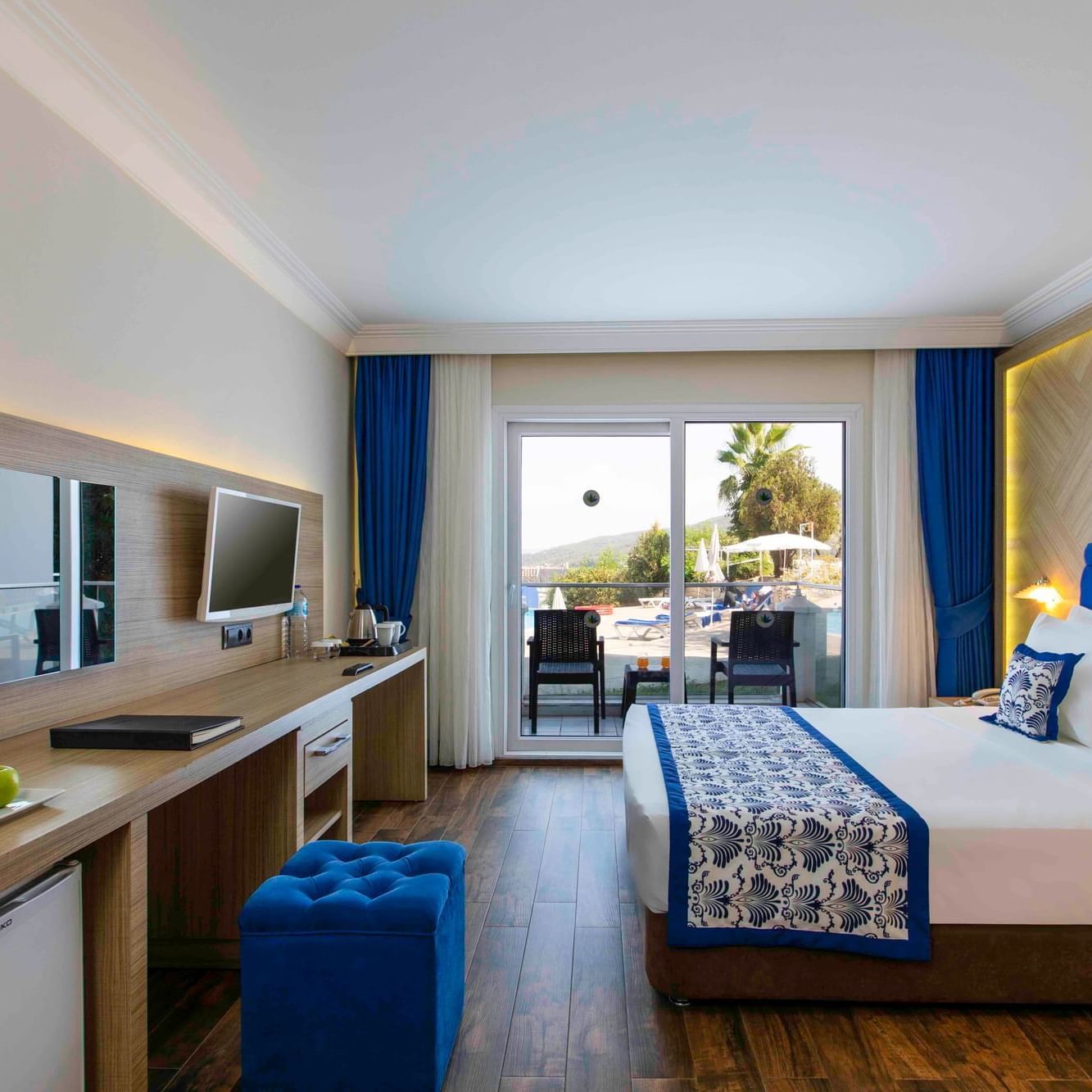 Номера с двухспальными или односпальными кроватями и видом на море расположены в главном здании отеля. В каждом номере повышенной категории есть телевизор с приемом спутниковых каналов, централизованная система кондиционирования воздуха с установленным временем функционирования, телефон с прямым доступом, бар-холодильник, фен, полностью укомплектованный санузел и балкон.