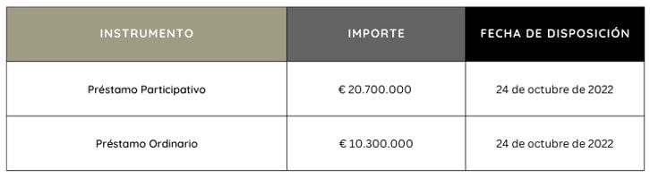 La ayuda asciende a un total de 31 millones de euros a través de un préstamo participativo por importe de 20.700.000 euros y un préstamo ordinario de 10.300.000 euros. Todos los fondos fueron recibidos en una única disposición, instrumentos ambos contemplados en la Orden ministerial del pasado 23 de julio de 2020 que publicó el acuerdo del Consejo de Ministros que establece el funcionamiento del fondo, dotado con un total de 10.000 millones de euros.